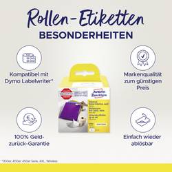 Bílé, opakovaně odstranitelné štítky na role AS0722540 ve formátu 32 x 57 mm od Avery Zweckform jsou ideální ideal pro dočasné popisování. Každé balení obsahuje 500 univerzálně použitelných štítků - ideal pro nízkou spotřebu při občasném použití v kanceláři a doma. Znovu odstranitelné nálepky jsou kompatibilní se štítky DYMO LabelWriter™ (LW330T, LW400 a LW450), z 100 %. Nahraďte si originální štítky DYMO® s vysoce kvalitními a cenově výhodnými štítky Avery Zweckform. Tyto termoštítky odpovídají výrobku DYMO® S0722540 (11354). Avery Zweckform lze snadno a rychle odstranit univerzální etikety pomocí softwaru DYMO® a snadno je i tisknout. Avery Zweckform je zárukou nejvyšší spokojenosti, jinak dostanete své peníze zpět na 100 % (podmínky účasti v www.avery-zweckform.com/rollenetiketten).