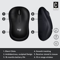 Logitech M220 Silent optická myš, přenos bezdrátový, 3 tlačítko, 1000 dpi, černá