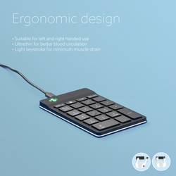 Vychutnejte si maximální svobodu při psaní s RC Go NumPad Break. Numerickou klávesnici lze ovládat jednou nebo pravou rukou a rozhodnout, kde ji umístíte na pracovní plochu. Díky ovládání numericky ovládaného bloku ruky, které nečiní pohyb myši, zůstanou obě ruce při práci v rámci šířky ramen a zátěž je rozdělena na obě ruce. Ideální ideal v kombinaci s klávesnicí R-Go Compact Break a R-Go Split Break. Mimořádně tenký design zajišťuje, že se vaše zápěstí při psaní nacházejí v přirozené, ploché poloze. Speciální nůžkový mechanismus na tlačítkách zajišťuje snadné stisknutí tlačítek, takže k ovládání stačí méně síly. Model R-Go NumPad je vybaven vestavěným ukazatelem množství barev, který signalizuje, kdy je čas přerušit práci (zelená, oranžová, červená). Pro další informace navštivte naši R-Go Break bok.