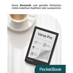 Díky technologii Bluetooth lze čtečku E-Reader propojit s bezdrátovými sluchátky a dalšími. Můžete tak uslyšíte knihy nebo nechat číst aktuální eBook přes funkci textového to speech - a to dokonce i bezpečně ve vaně, protože kapesní Book PocketBook Verse pro je vodotěsný podle IPX8.