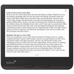 Barevná teplota je u integrovaných vrstev čtení zajištěna díky barevné barvě Tolino Vision vždy na nejvyšší úrovni osvětlení při čtení. V souladu s přirozeným denním světlem se tolino vision color na přání září teplým bílým světlem přepne na světlo color večer. Takže nebude váš biorytmus rušen a vychutnejte si uvolněné čtenářské emoce kdykoli ve dne i v noci. Při denním světle můžete osvětlení samozřejmě také úplně vypnout a prodloužit tak výdrž akumulátoru. Díky neoslňující obrazovce si můžete číst jako na papíru, a to zcela bez rušivých reflexí slunečním zářením.