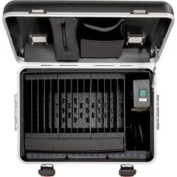 S mobilním úložným systémem PARAPROJECT® Case TC15 Plus zajistíte nejen své tablety bezpečně, ale můžete své vybavení navíc nabíjet a přepravovat z a na B. Mobilní skladovací stanice nabízí prostor až pro 15 tabletů s maximální velikostí 11,5“. Ať už otevřený nebo zavřený, kufr funguje pro všechny iPady®, Android a tablety Windows, které lze nabíjet přes USB-a nebo USB-C®. Další výhodou inteligentního řešení pro ukládání je elektrický tower s funkcí zapnutí/vypnutí a také zásuvka pro přístupový bod. Díky integrovaným modulům TwinCharge to je možné. Navíc jej lze nabíjet podle standardů QuickCharge a flexibilně podle standardu USB-PD (Power Delivery). Dvě kapsy na víku pro příslušenství a drobné díly nabízejí přidanou hodnotu. Pomocí vnějšího spínače lze pohodlně zapnout a vypnout kompletní pouzdro. Lehká kola uložená v kuličkových ložiscích, stabilní, oboustranné rukojeti a 4-násobné teleskopické prodloužení umožňují pohodlnou přepravu přístroje PARAPROJECT® Case TC15 Plus. Skořepina z X-ABS plastu je velmi odolná a chrání tak před vnějšími vlivy. Dva axiální ventilátory integrované v podlaze navíc zajišťují optimální cirkulaci vzduchu a spolehlivě chrání před přehřátím.