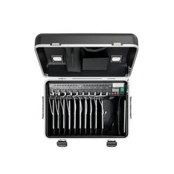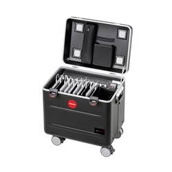 Díky kufříku PARAPROJECT® Case i10 lze bez problémů uložit a přepravovat 10 iPadu v centrální nabíjecí a synchronizační stanici. Tento flexibilní systémový kufr nabízí ve 10 přihrádkách z con-Pearl® pro optimální rychlost nabíjení a synchronizaci až 10 iPadu. Díky USB konektorům umístěným v řadě umožňuje čisté vedení kabelů. Praktická technologie „Flex2Connect“ umožňuje výměnu nebo kombinování nabíjecích, Sync kabelů a typů konektorů. Kromě toho lze k dispozici připojení pro notebook Master, příslušenství, jako je například přístupový bod. Úchyty na straně usnadňují přenášení a ochranu číselných zámků proti neoprávněnému přístupu. Jeho nízká hmotnost v kombinaci s 4 kolečky „EasyMove“ a teleskopickou rukojetí až 1 m činí z kufru velmi pohodlnou manipulaci. Odolný černý vnější obal z plastu X-ABS v hliníkovém rámu chrání před vnějšími vlivy. Pouzdro PARAPROJECT® Case i10 přesvědčí kromě promyšlených funkcí i příjemným designem a kvalitními zpracovanými materiály. Je kompatibilní se všemi iPad generací od 4 Air a mini, kromě iPad pro 12,9 palců.